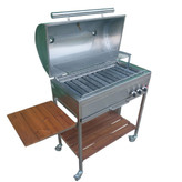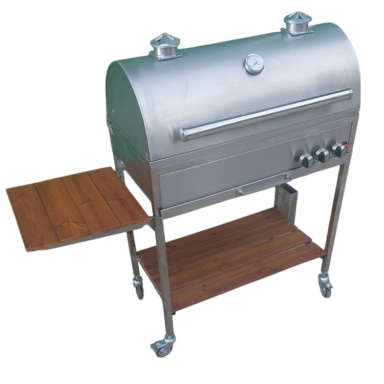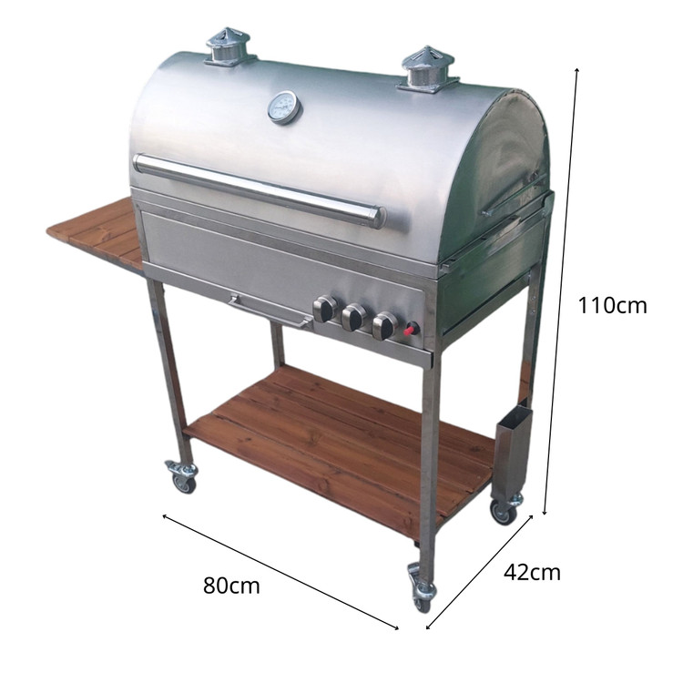 این باربیکیو با طول 80سانتی متر میتواند جهت پخت کباب در منزل و فضای باغ یا آلاچیق شما مورد استفاده قرار بگیرد. این باربیکیو به صورت پیش فرض گاز شهری بوده و به درخواست شما با تغییر ژیکلور قابلیت استفاده از گاز کپسول وجود دارد. از دیگر امکانات این محصول میتوان به دارا بودن فندک اشاره کرد که تنها با باز کردن گاز و سپس فشردن دکمه فندک آتش شعلهور میشود. یکی از معضلات هنگام کباب کردن به همریختگی اطراف کباب پز بوده که به دلیل وجود میز تاشو ترمو وود کنار آن و قفسه موجود در قسمت پایه که فضای مناسبی را برای جایگیری وسایل محیا کرده است دیگر شاهد آن نیستیم.