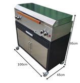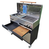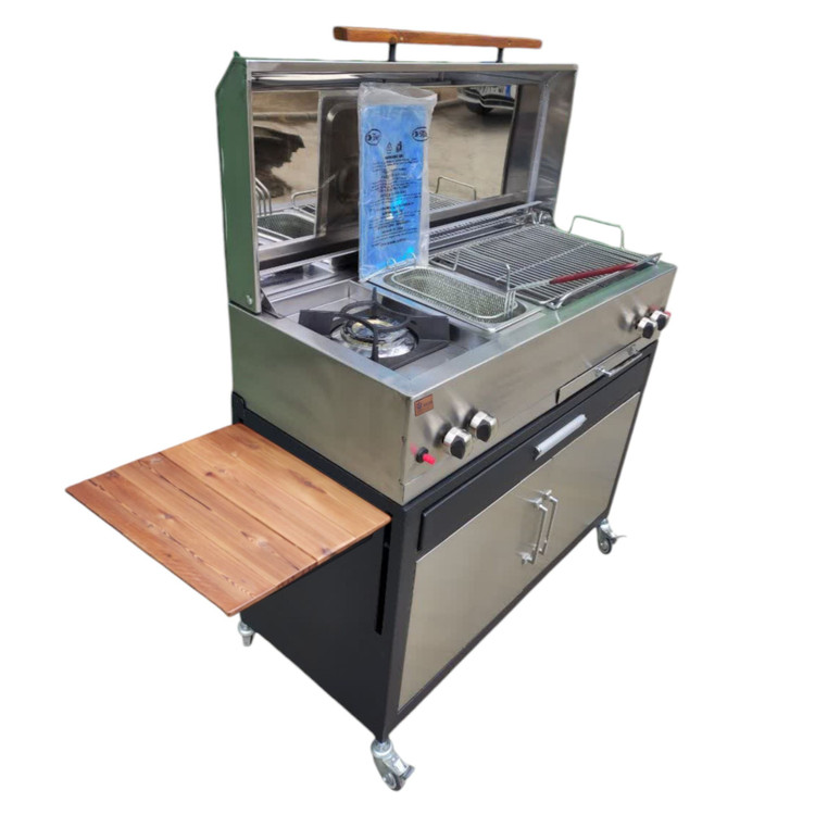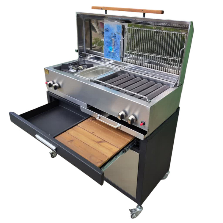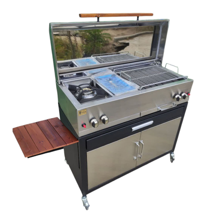 طراحی بدنه از جنس استیل این باربیکیو از استیل ساخته شده است. در قسمت پایه ،یک کابینت ترکیبی از استیل و فولاد طراحی شده که می توان از آن برای قرار دادن لوازم مختلف استفاده کرد.این محصول به دو عدد کشو مگنت مجهز شده که فضای مناسبی جهت قرار دادن وسایل مختلف فراهم کرده است. برای باز کردن کشوها کافی است قسمت متصل به مگنت را به داخل فشار دهید تا کشو به طور خودکار باز گردد. قسمت پایه به چهار عدد چرخ دایکاست فلزی سایز بزرگ مجهز شده است که حمل و جابجایی آن را آسان می کند.علاوه بر این، قسمت کباب پز از کابینت جدا می شود تا جابهجایی محصول آسان تر شود. این باربیکیو دارای 7مشعل در قسمت کباب پز است. روی هر یک از مشعل ها یک عدد ناودانی از جنس چدن قرار داده شده که به پخش ملایم حرارت کمک می کند. چدن می تواند حرارت را در خود نگه دارد. این ویژگی به پخت یکنواخت غذا کمک کرده و از سوختن بافت سطحی گوشت جلوگیری می کند. به کمک این طراحی روند پخت انواع گوشت به طور کامل انجام می شود. این باربیکیو به بن ماری سرخ کن به همراه توری سرخ کن و پلوپز مجهز شده تا روند پخت را از هر نظر کامل و شما را از اجاق های اضافی دیگر بی نیاز کند. افزون بر این ها یک توری گریل متحرک در قسمت کبابپز قرار گرفته که به وسیله آن میتوان انواع ماهی کبابی،پیتزا،سبزیجات کبابی و ...را فراهم کرد. چهار ولوم soft touchچرخشی تنظیم دما بی نهایت متغیر نتیجه کباب کردن را مطابق میل شما تنظیم می کند. دو ولوم برای قسمت کبابپز و دو ولوم باقی مانده برای سرخ کن و پلوپز تعبیه شده است. این باربیکیو با طول100سانتی متر که شامل سرخ کن و پلوپز می باشد. این باربیکیو به صورت پیش فرض گاز شهری می باشد. از دیگر امکانات این محصول میتوان به دارا بودن فندک اشاره کرد که تنها با باز کردن گاز و سپس فشردن دکمه فندک آتش شعلهور میشود. یکی از معضلات هنگام کباب کردن به همریختگی اطراف کباب پز بوده که به دلیل وجود میز تاشو از جنس چوب ترمو وود کنارآن، کابینت و کشو مگنت که فضای مناسبی را برای جایگیری وسایل محیا کرده است دیگر شاهد آن نیستیم. سینی بزرگ چربی گیر جهت جمع آوری روغن ریخته شده با قابلیت جدا شدن به منظور تمیز کردن راحت و آسان در قسمت زیر کباب پز طراحی شده تا نظافت باربیکیو آسان گردد.
