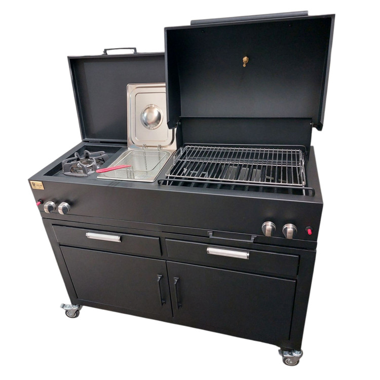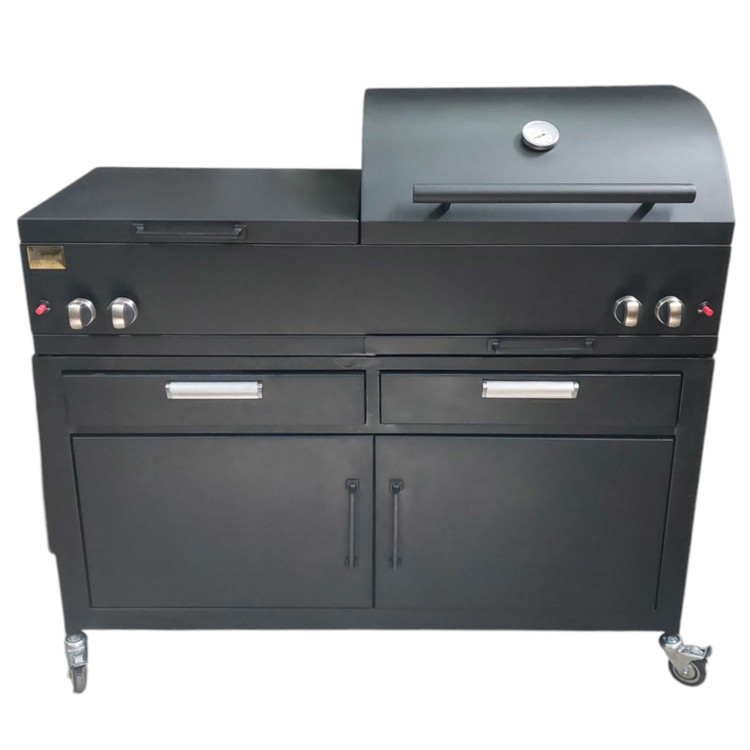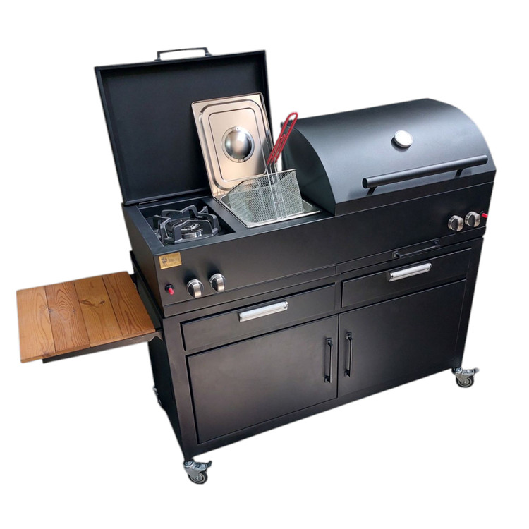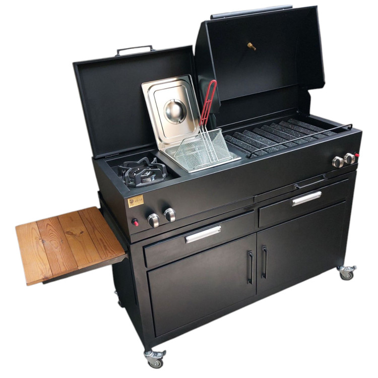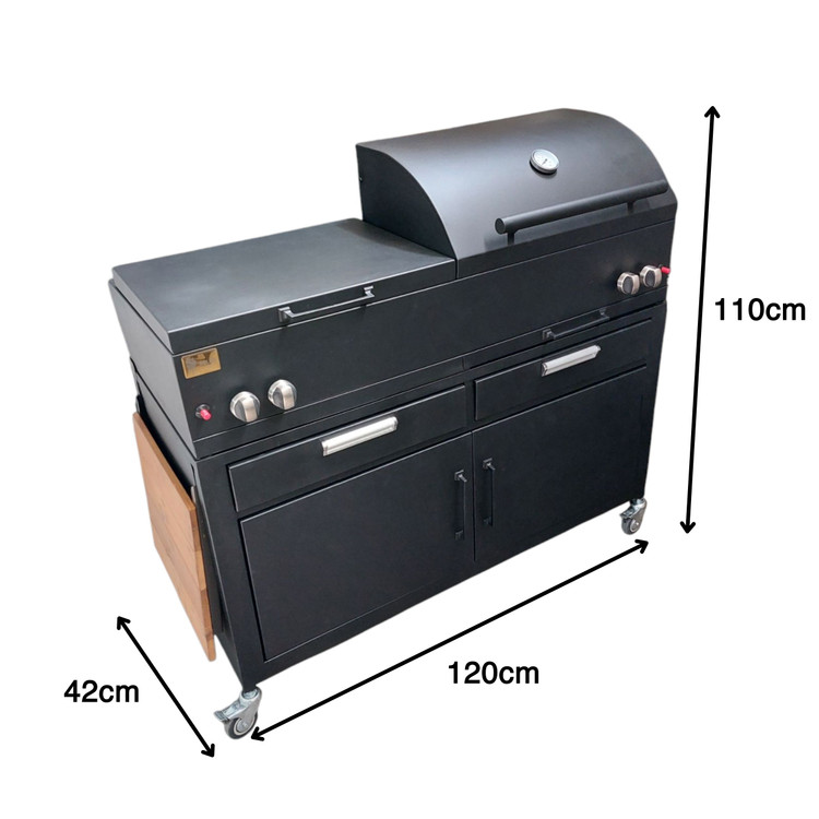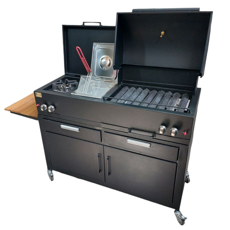 این باربیکیو از فولاد ساخته شده است. در قسمت پایه ،یک کابینت ترکیبی از فولاد طراحی شده که می توان از آن برای قرار دادن لوازم مختلف استفاده کرد.این محصول به دو عدد کشو مگنت مجهز شده که فضای مناسبی جهت قرار دادن وسایل مختلف فراهم کرده است. برای باز کردن کشوها کافی است قسمت متصل به مگنت را به داخل فشار دهید تا کشو به طور خودکار باز گردد. قسمت پایه به چهار عدد چرخ دایکاست فلزی سایز بزرگ مجهز شده است که حمل و جابجایی آن را آسان می کند.علاوه بر این، قسمت کباب پز از کابینت جدا می شود تا جابهجایی محصول آسان تر شود. این باربیکیو دارای 9مشعل در قسمت کباب پز است. روی هر یک از مشعل ها یک عدد ناودانی از جنس چدن قرار داده شده که به پخش ملایم حرارت کمک می کند. چدن می تواند حرارت را در خود نگه دارد. این ویژگی به پخت یکنواخت غذا کمک کرده و از سوختن بافت سطحی گوشت جلوگیری می کند. به کمک این طراحی روند پخت انواع گوشت به طور کامل انجام می شود. این باربیکیو به بن ماری سرخ کن به همراه توری سرخ کن و پلوپز مجهز شده تا روند پخت را از هر نظر کامل و شما را از اجاق های اضافی دیگر بی نیاز کند. افزون بر این ها یک توری گریل متحرک در قسمت کبابپز قرار گرفته است. چهار ولوم soft touchچرخشی تنظیم دما بی نهایت متغیر،به همراه ترمومتر عقربه ای نتیجه کباب کردن را مطابق میل شما تنظیم می کند. دو ولوم برای قسمت کبابپز و دو ولوم باقی مانده برای سرخ کن و پلوپز تعبیه شده است. این باربیکیو با طول120سانتی متر که شامل سرخ کن و پلوپز می باشد میتواند جهت پخت کباب در منزل شما مورد استفاده قرار بگیرد. این باربیکیو به صورت پیش فرض گاز شهری بوده وبا تغییر ژیکلور قابلیت استفاده از گاز کپسول وجود دارد. از دیگر امکانات این محصول میتوان به دارا بودن فندک اشاره کرد که تنها با باز کردن گاز و سپس فشردن دکمه فندک آتش شعلهور میشود. یکی از معضلات هنگام کباب کردن به همریختگی اطراف کباب پز بوده که به دلیل وجود میز تاشو از جنس چوب ترمو وود کنارآن، کابینت و ۲عددکشو مگنت که فضای مناسبی را برای جایگیری وسایل محیا کرده است دیگر شاهد آن نیستیم. سینی بزرگ چربی گیر جهت جمع آوری روغن ریخته شده با قابلیت جدا شدن به منظور تمیز کردن راحت و آسان در قسمت زیر کباب پز طراحی شده تا نظافت باربیکیو آسان گردد.