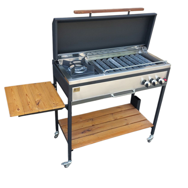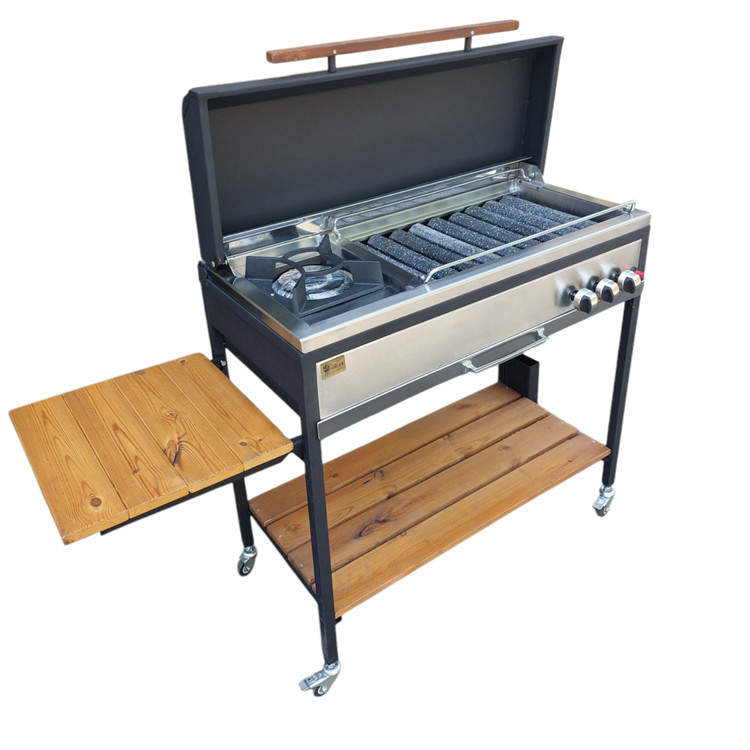 این باربیکیو دارای 9مشعل در قسمت کباب پز است. روی هر یک از مشعل ها یک عدد ناودانی از جنس چدن قرار داده شده که به پخش ملایم حرارت کمک می کند. چدن می تواند حرارت را در خود نگه دارد. این ویژگی به پخت یکنواخت غذا کمک کرده و از سوختن بافت سطحی گوشت جلوگیری می کند. به کمک این طراحی روند پخت انواع گوشت به طور کامل انجام می شود.