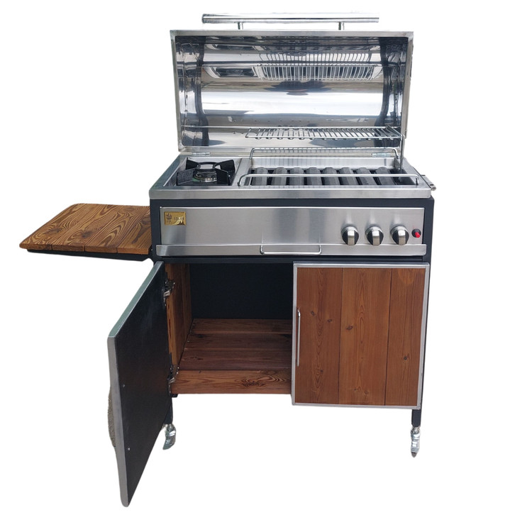 بدنه این محصول از استیل ساخته شده است. در قسمت پایه باربیکیو یک کابینت از جنس چوب طراحی شده که می توان از آن برای قرار دادن لوازم مختلف استفاده کرد.