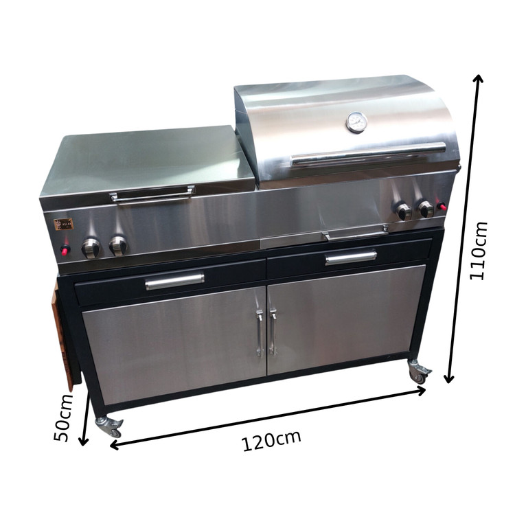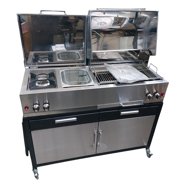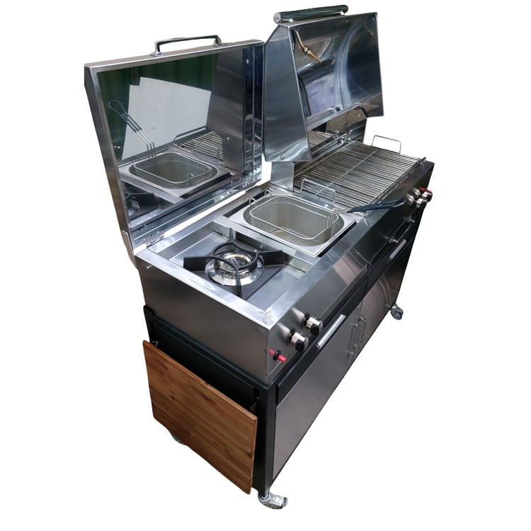 این باربیکیو با طول120سانتی متر که شامل سرخ کن و پلوپز می باشد میتواند جهت پخت کباب در منزل و فضای باغ یا آلاچیق شما مورد استفاده قرار بگیرد.