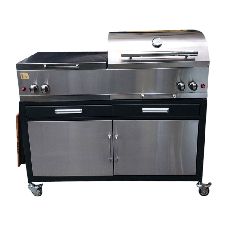 قسمت پایه به چهار عدد چرخ دایکاست فلزی سایز بزرگ مجهز شده است که حمل و جابجایی آن را آسان می کند.علاوه بر این، قسمت کباب پز از کابینت جدا می شود تا جابهجایی محصول آسان تر شود.